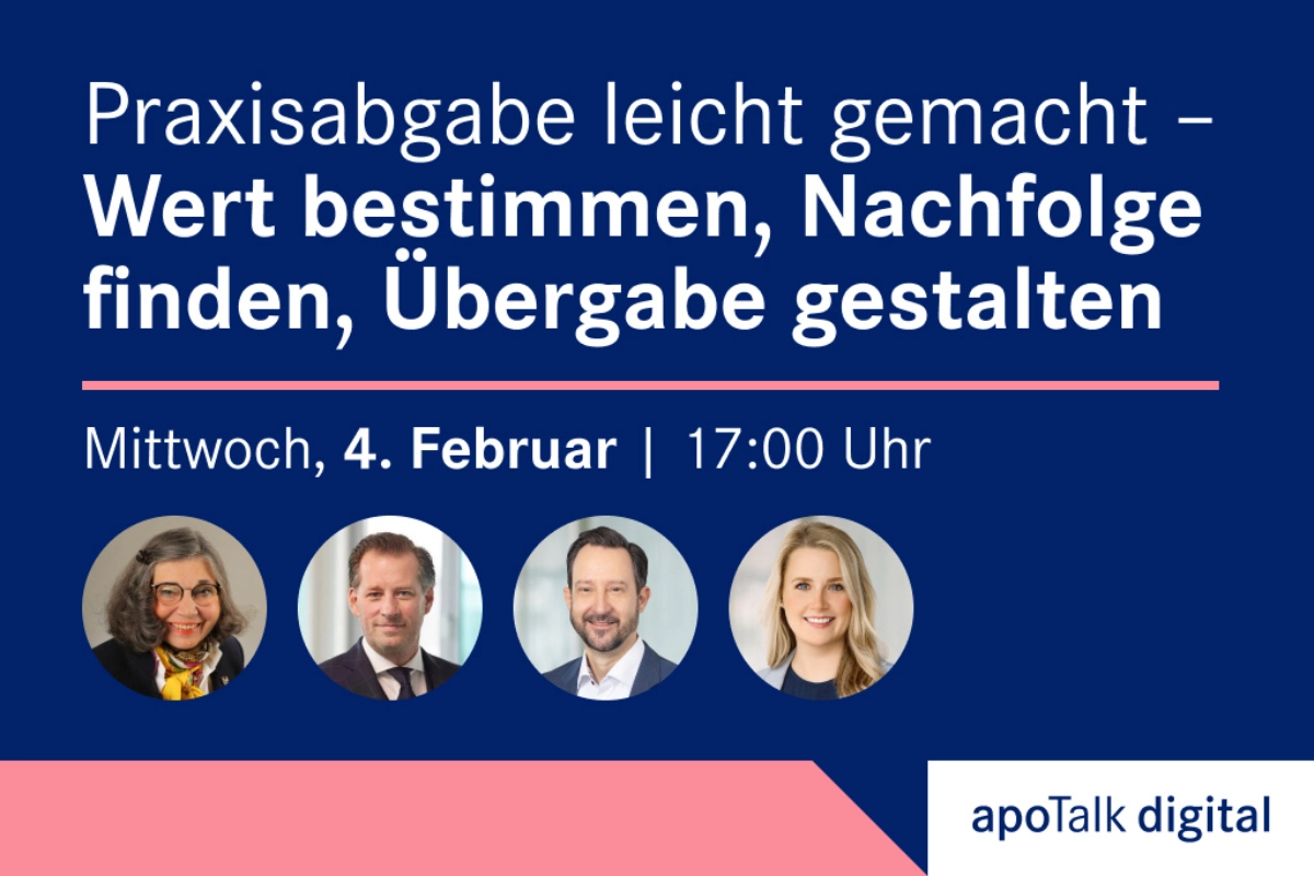 Ihre Praxis ist mehr als ein Beruf – sie ist Ihr Lebenswerk. Geprägt von Ihren Entscheidungen, getragen von Leidenschaft und Geduld. Nach vielen Jahren erfolgreicher Führung steht irgendwann für jeden der Moment bevor: die Praxisabgabe.In unserem apoTalk digital Praxisabgabe leicht gemacht gehen wir genau diesen Fragen auf den Grund.