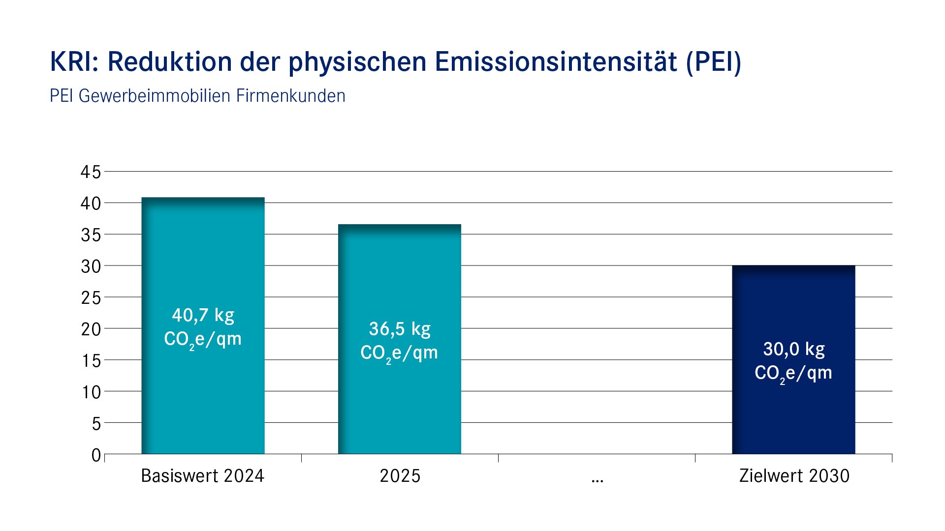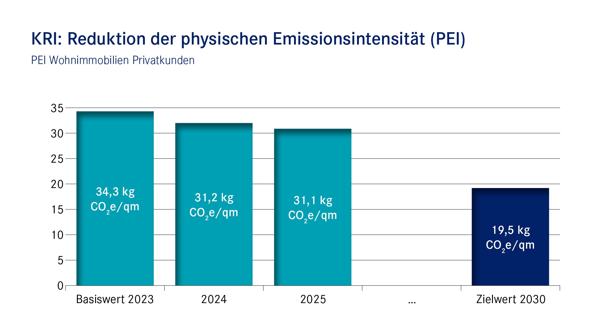 PEI misst die absoluten Emissionen von finanzierten Immobilien im Verhältnis zu deren Wohnfläche (Angabe erfolgt in CO₂-Äquivalenten pro Quadratmeter). Ein steigender Anteil energieeffizienter Immobilien im Neugeschäft kann zu einer geringeren Emissionsintensität beitragen. Das PEI-Ziel wird perspektivisch relevant für die Vergütung von Vorstand und Führungskräften sein.