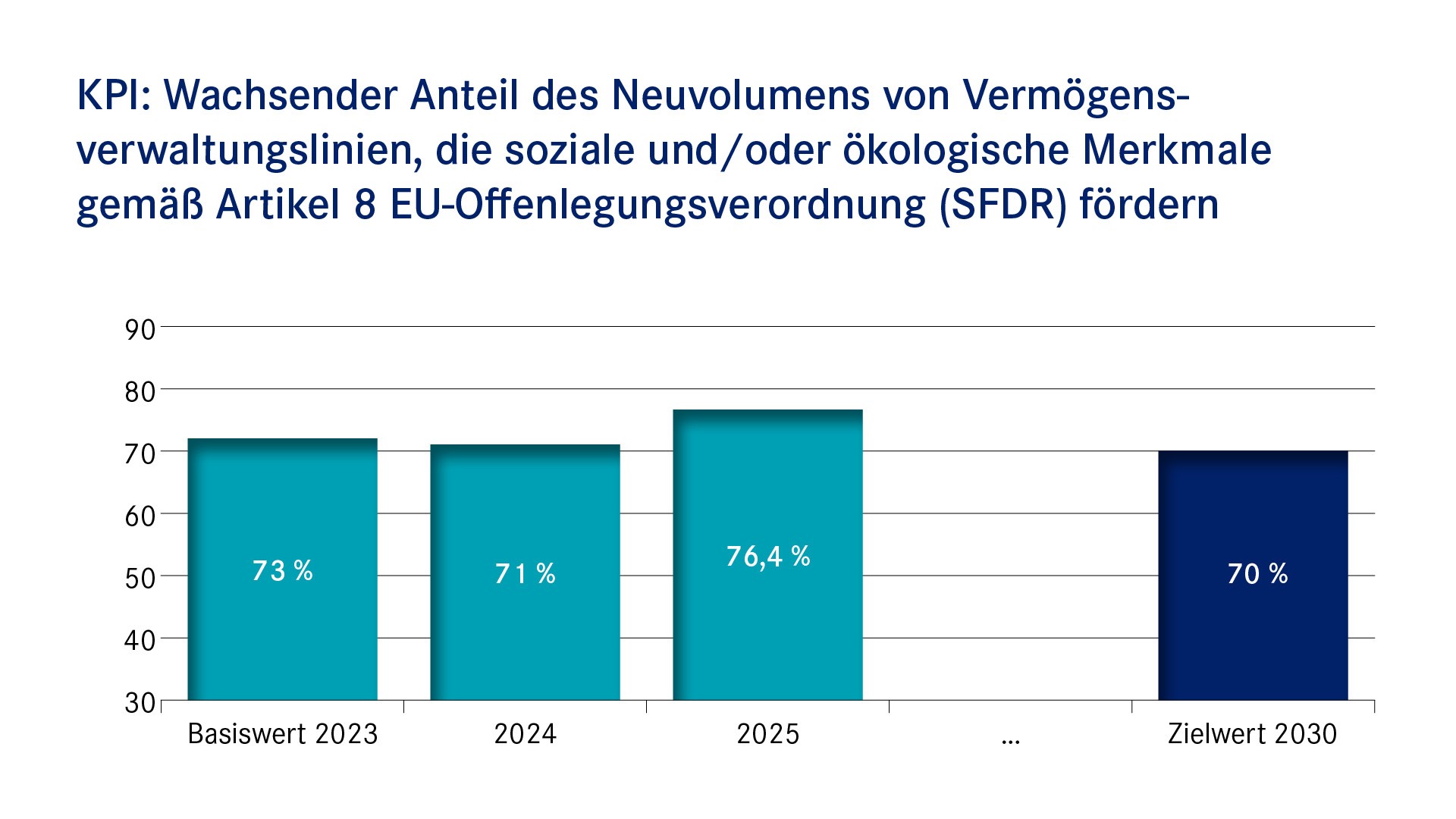 Die apoBank richtet ihre bestehenden Vermögensverwaltungslinien sukzessive stärker an ESG‑Kriterien aus und erweitert ihr Angebot entsprechend. Auch die Nachfrage unserer Kundinnen und Kunden nach Anlageoptionen mit ökologischen und/oder sozialen Merkmalen gemäß Artikel 8 SFDR steigt stetig, sodass wir den dafür definierten Zielwert für 2030 bereits heute übertreffen.